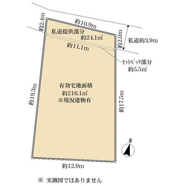 現況:古家有(空家)、※現況渡し 宅地面積及び私道提供部分面積は境界確定前の為概算面積となります。宅地面積:約221.6㎡(セットバック約5.5㎡含む)、私道提供部分約24.1㎡、建物再建築時セットバック要。 ガス:都市、水道:公営、下水:公共 |