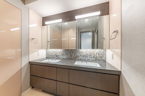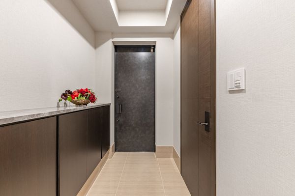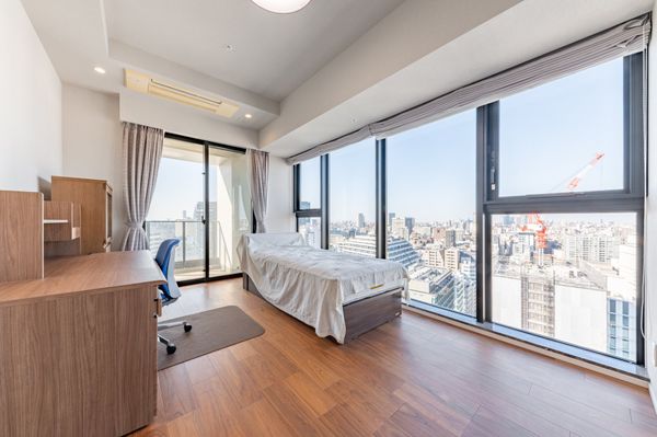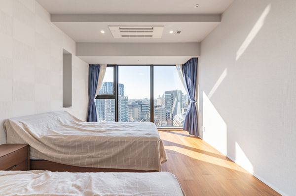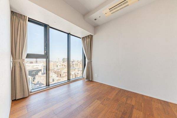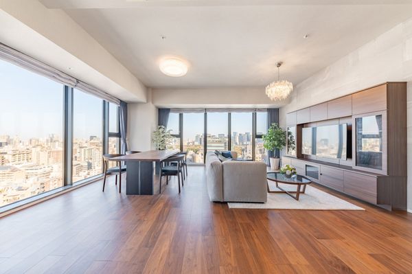 22階プレミアムフロア(1フロアに2住戸) 北・東・西向き三方角住戸 東側は皇居敷地、スカイツリーが望めます。 東・北向き角部屋のリビング・ダイニング天井高2,800mm 床暖房・天井カセット型エアコン・IHコンロ 間取:3LDK+N+2WIC+SIC、トイレ2カ所有