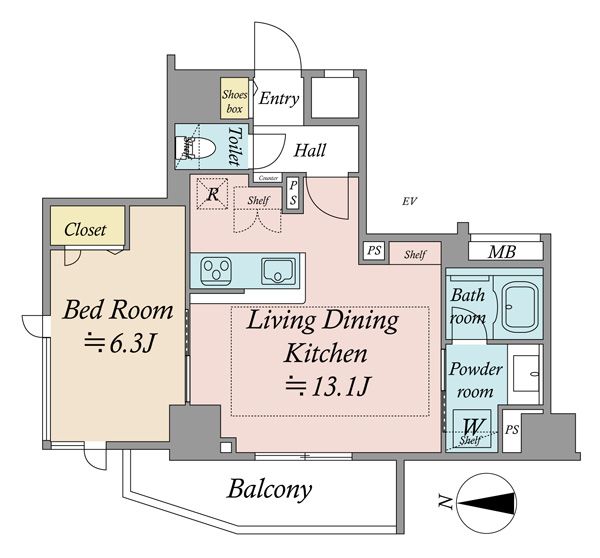間取り 1LDK 専有面積 46.24㎡(約13.98坪):壁芯