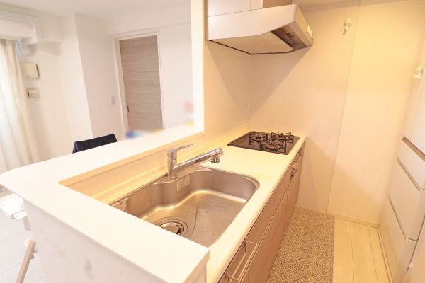 三口ガラストップコンロ、浄水器一体型シャワー水栓、整流板付レンジフードを備えた充実のシステムキッチン