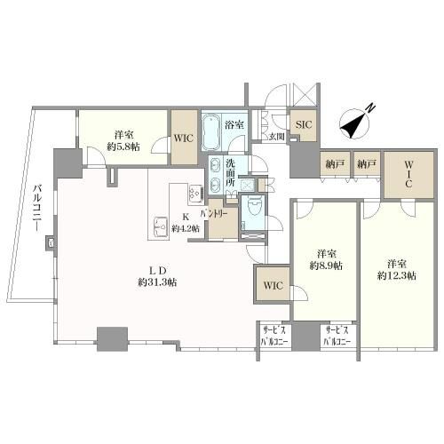 間取 3LDK+3WIC+SIC WIC=ウォークインクローゼット、SIC=シューズインクローゼット |