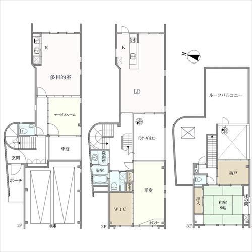 間取 2LDK+多目的室+2S+WIC 建物延面積に車庫29.42平米含 S=サービスルーム(1階)・納戸(3階)、WIC=ウォークインクローゼット。家具・調度品は販売価格に 航空法 |