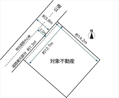 ■土地面積には道路復元部分として約1.3㎡が含まれます。建築をおこなう場合は道路復元が必要です。、国土法:否 |