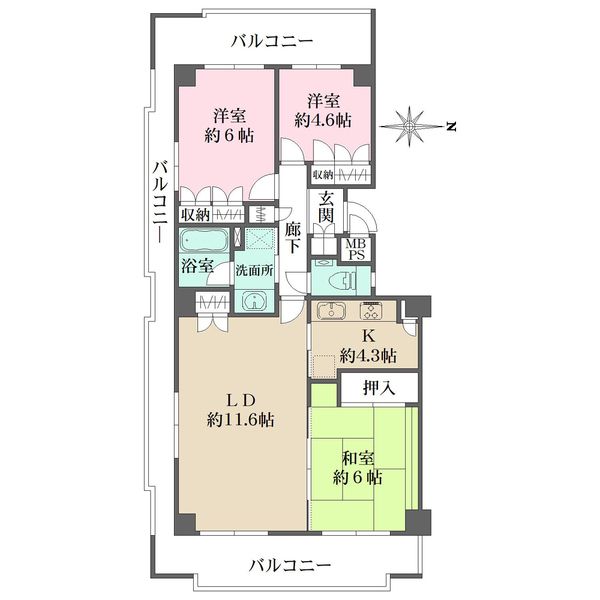 ◆6階角住戸◆3面引き回しバルコニー×全居室バルコニーサイド 大規模修繕工事実施中(2026年5月末完了予定) |