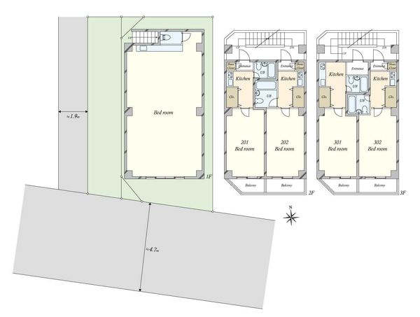 接道2:北西、幅員0.8m 専有面積:19.12m2~47.29m2/住戸数:5戸/設備:都市ガス、公営水道、本下水/エレベーター無 住戸数:5戸、建物内各戸専有面積(最小):19.12㎡、建物内各戸専有面積(最大):47.29㎡ |