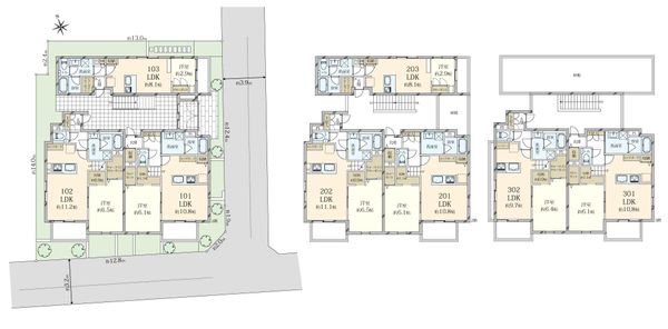 接道2:南東、幅員3.2m 専有面積:27.95m2~44.92m2/住戸数:8戸/設備:都市ガス、公営水道、本下水/エレベーター無 住戸数:8戸、建物内各戸専有面積(最小):27.95㎡、建物内各戸専有面積(最大):44.92㎡ |