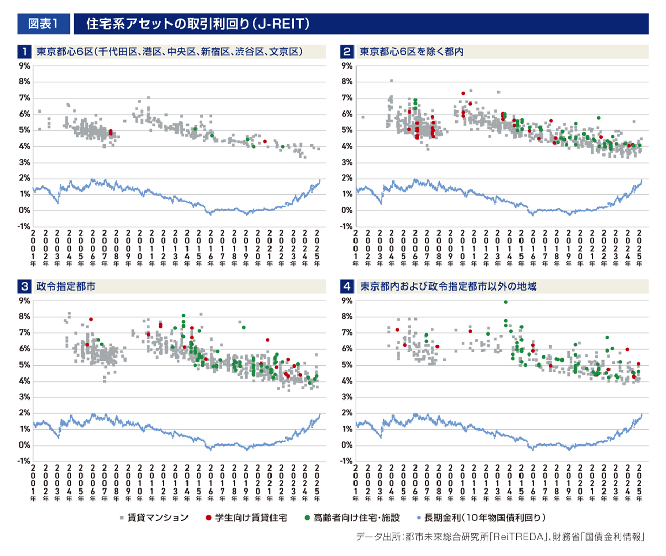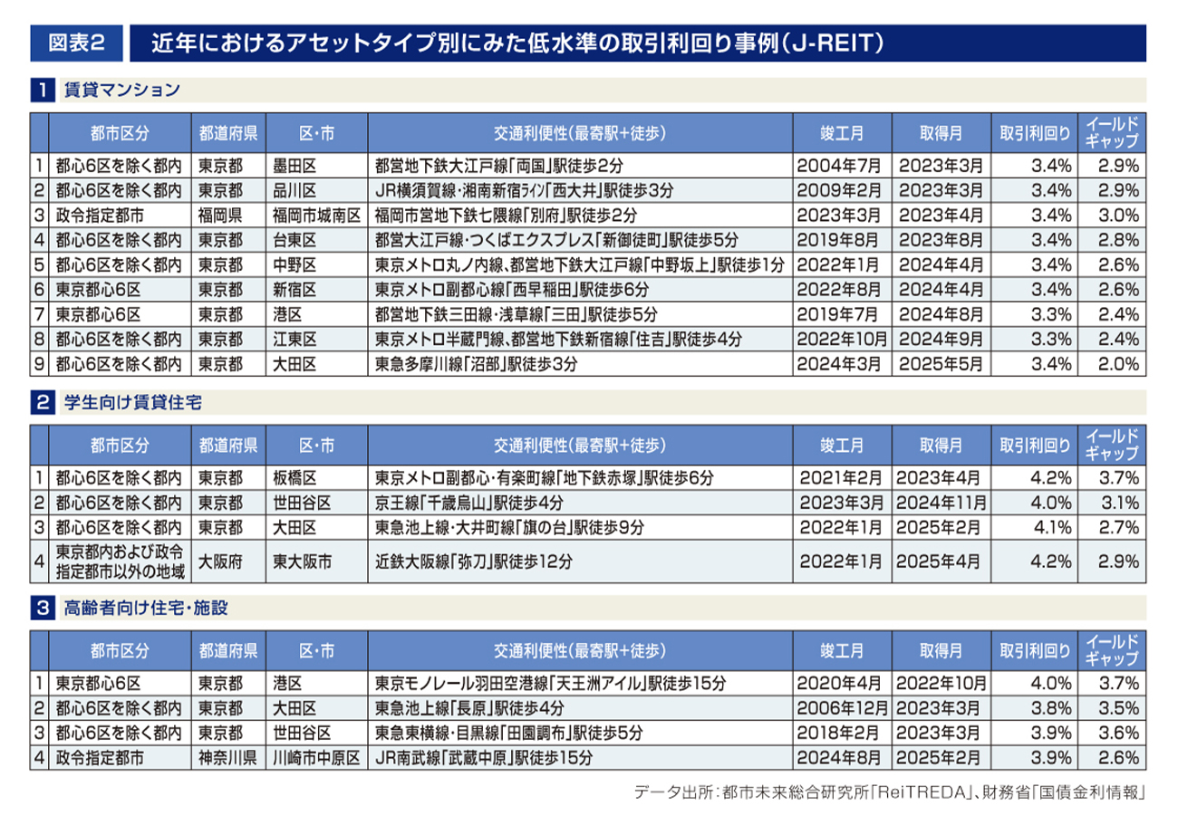 J-REITにおける近年の住宅系アセット(一般的な賃貸マンションや学生向け賃貸住宅、高齢者向け住宅・施設)の取引利回り※1は、2006年~2008年頃のファンドバブル期の水準を下回って推移している[図表1]。東京都内で取引利回りが低い事例が多く[図表1左上・右上、図表2]、2024年には港区(三田駅徒歩5分)や江東区(住吉駅徒歩4分)の賃貸マンションで3.3%の事例がみられた[図表2①の7・8]。イールドギャップ※2は取引利回りの低下および長期金利の上昇により、2025年には2.0%まで縮小している事例がみられた[同①の9]。
