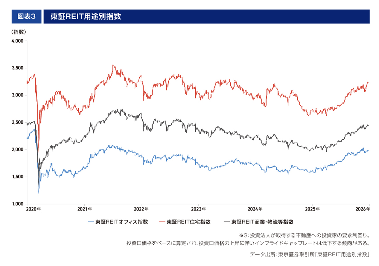 東証REIT住宅指数は2021年から低下基調が続いていたが、2025年4月を底に、他の用途別指数と同様に上昇基調へ転じている[図表3]。自己投資口の取得等による資本効率の改善や、米国の利下げに伴う相対的なJ-REITの分配金利回りの高さへの注目から海外投資家の買いが入っていることに加え、住宅系リートでは賃料の上昇や高水準で推移する稼働率により、賃貸事業収益が概ね増加していることから指数が堅調に推移していると考えられる。今後も投資口価格が上昇する場合、公募増資しやすい環境になる他、物件を取得する際の利回りの目安となるインプライドキャップレート※3の低下も見込まれ、住宅系リートによる物件取得が増加する可能性がある。